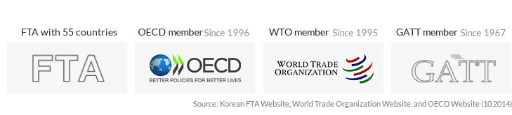Korea is ready for global trade, and currently holds FTA with 55 countries. It has been an OECD member since 1996, WTO member since 1995, and a GATT member since 1967.