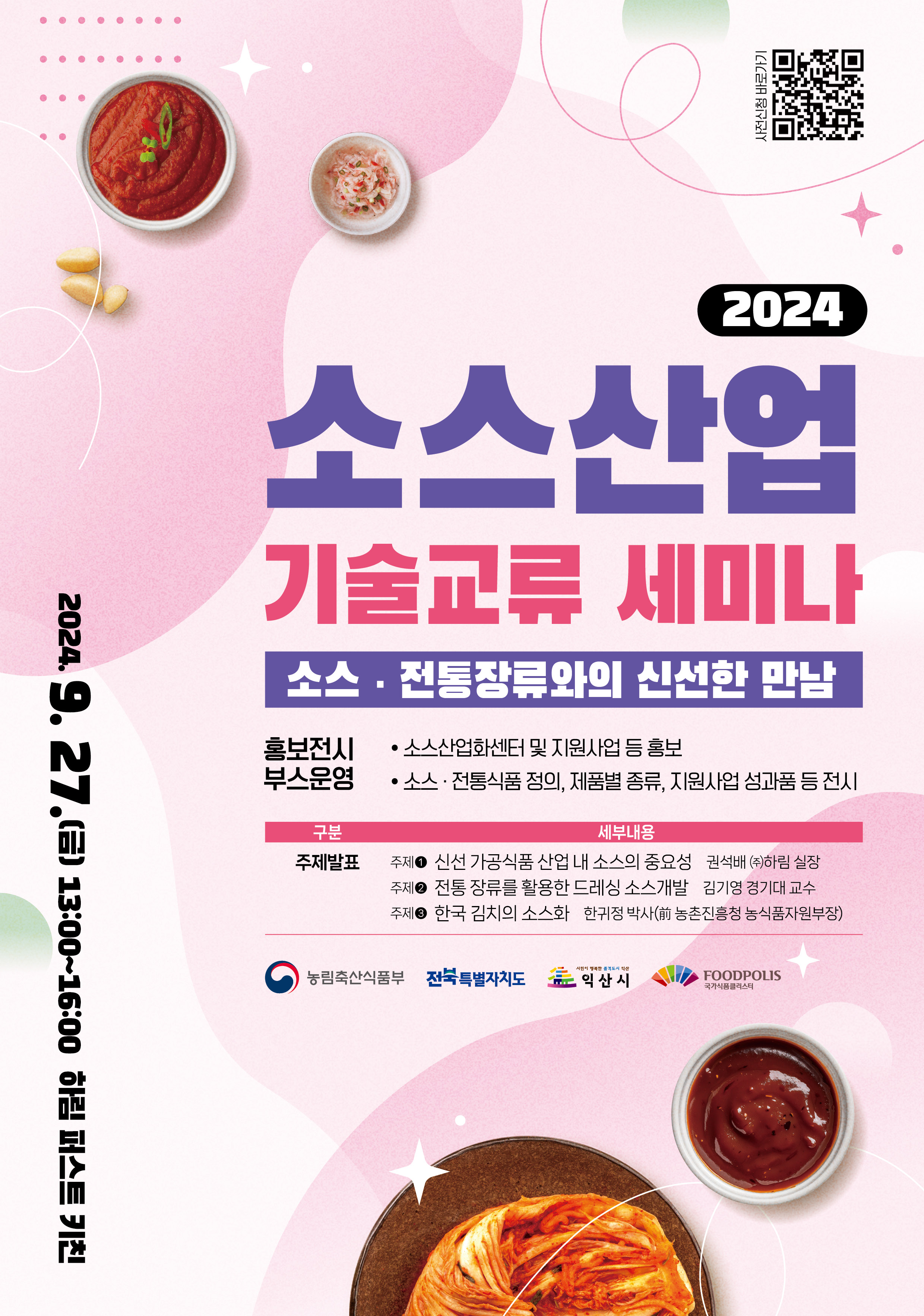 한국식품산업클러스터진흥원(이하 ‘식품진흥원’)이 9월 27일(금) 오후 1시부터 하림 퍼스트 키친에서 ‘2024 소스산업 기술교류 세미나(이하 ‘세미나’)’를 개최한다.