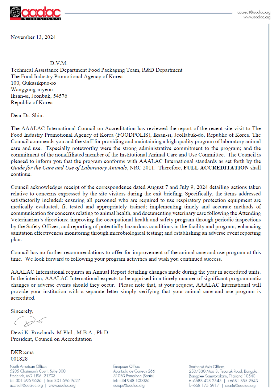 한국식품산업클러스터진흥원(이사장 김덕호, 이하 식품진흥원)은 국제실험동물관리평가인증협회(AAALAC international, 이하 AAALAC)의 완전인증(Full Accreditation, 이하 완전인증)을 재획득하여 국제 수준의 동물실험 전문기관임을 인정받았다고 19일 밝혔다.