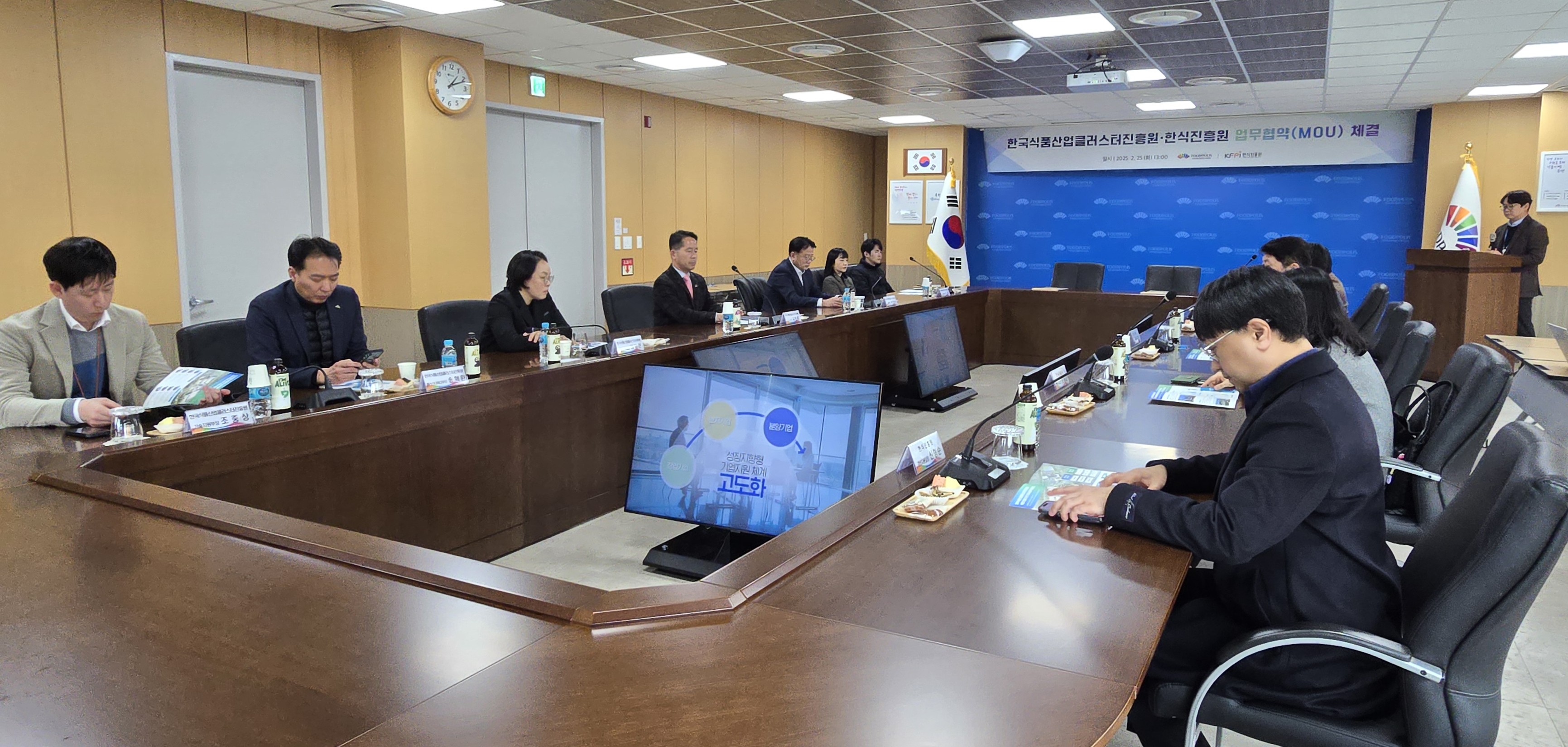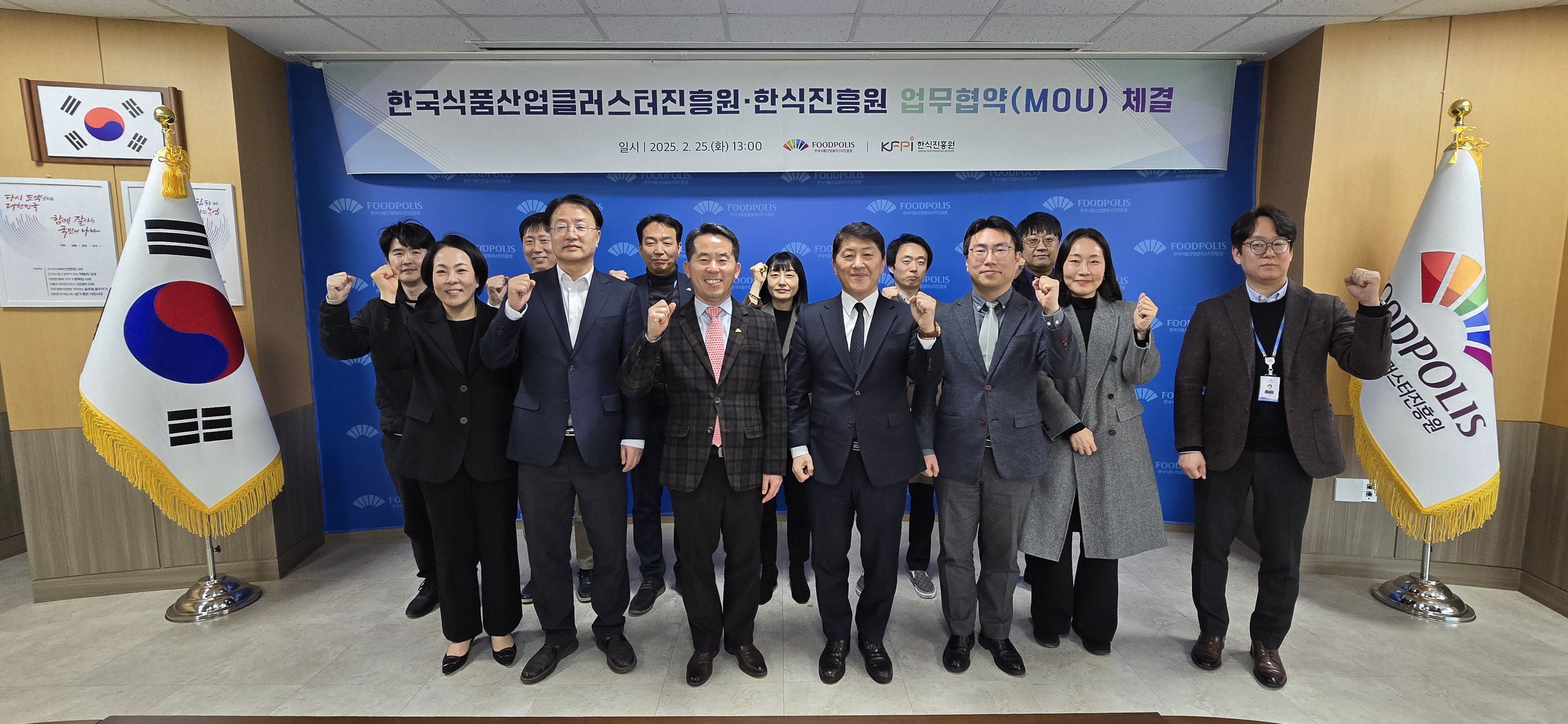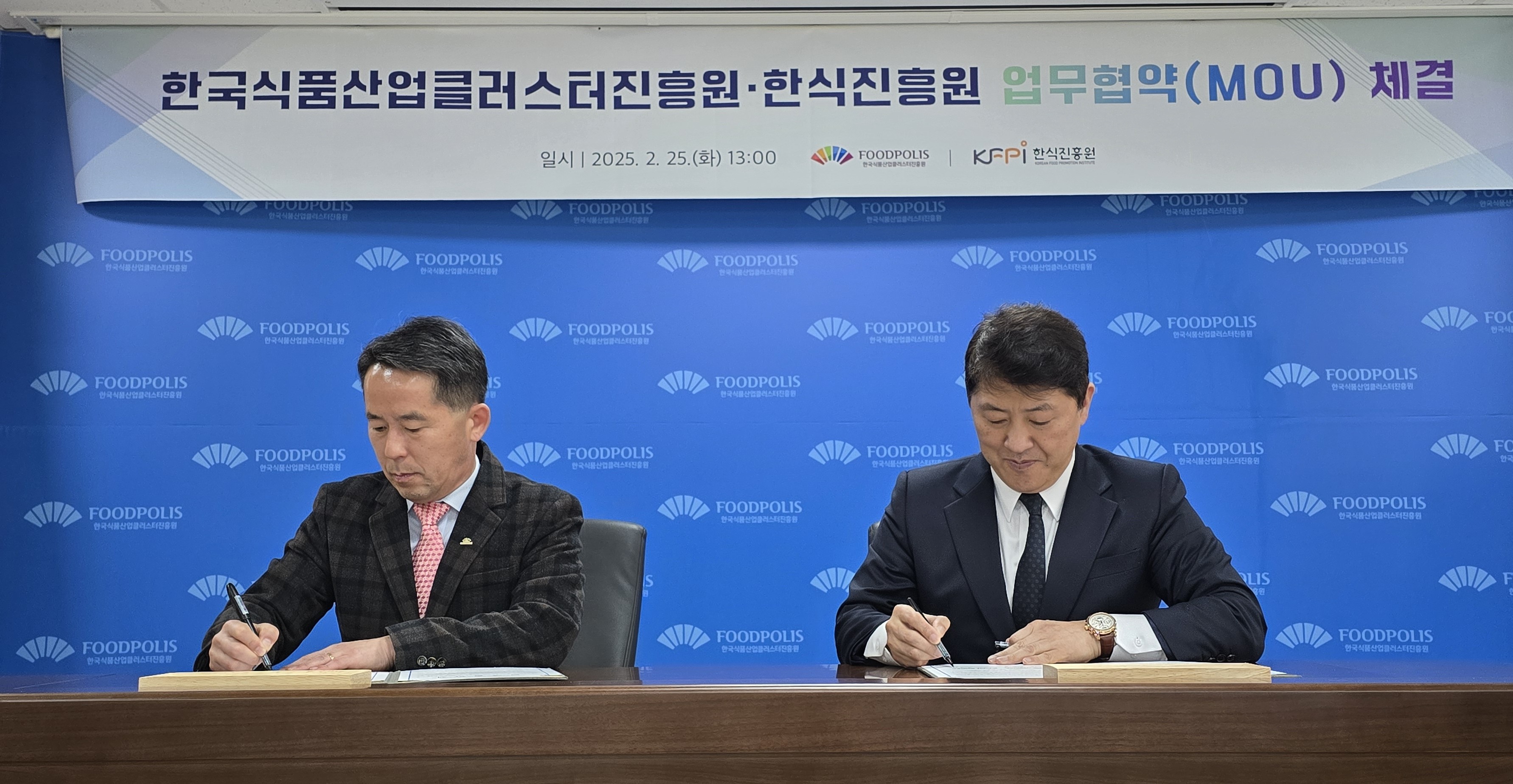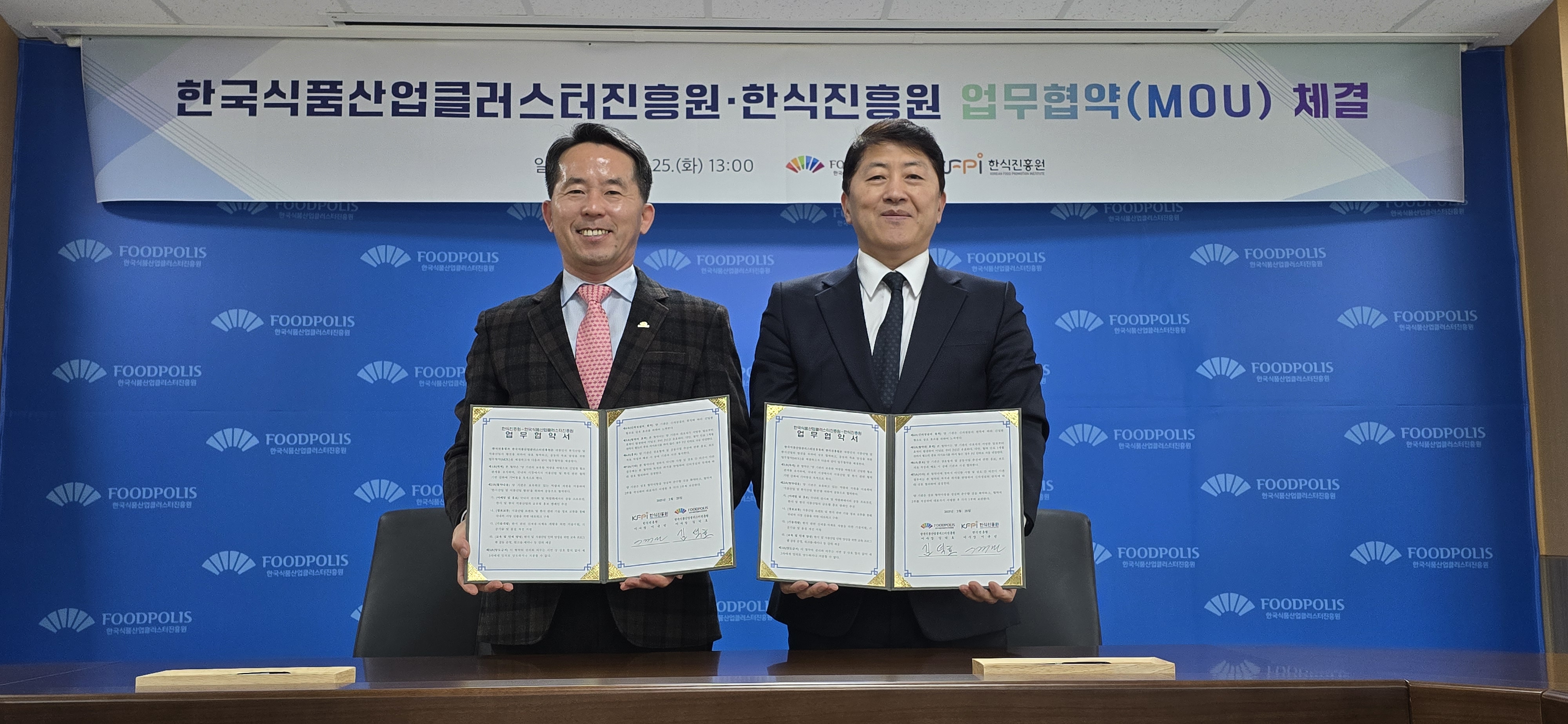 한국식품산업클러스터진흥원(이사장 김덕호, 이하 ‘식품진흥원’)과 한식진흥원(이사장 이규민)은 2월 25일 식품진흥원 본관에서 ‘한식 및 식품산업 국제 경쟁력 강화를 위한 업무협약(MOU)’을 체결했다고 밝혔다. 이번 협약은 대한민국 식품산업과 한식의 세계화 및 국제 경쟁력 강화에 중추적인 역할을 할 것으로 기대된다.