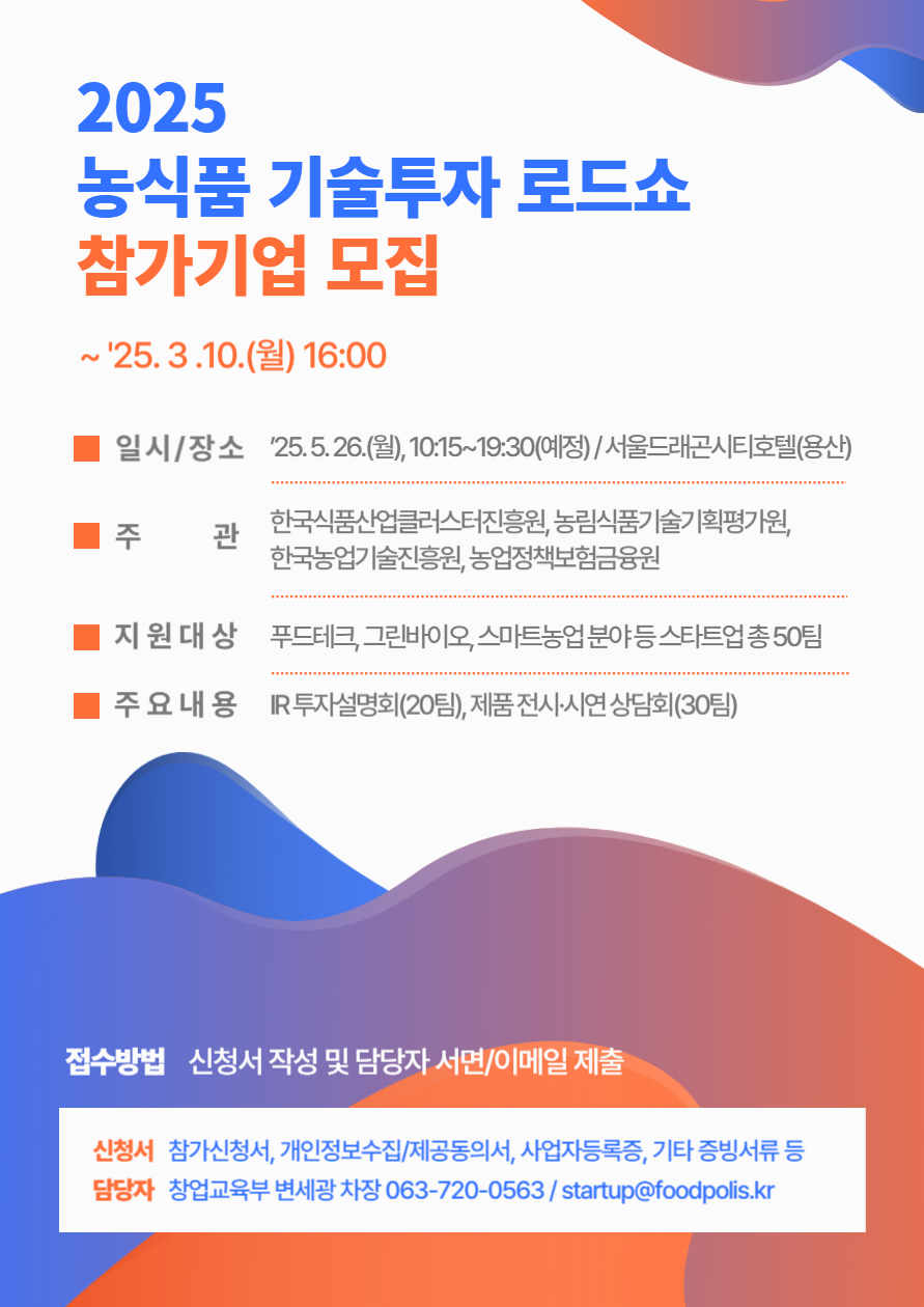 2025 농식품 기술투자 로드쇼 참가기업 모집 공고