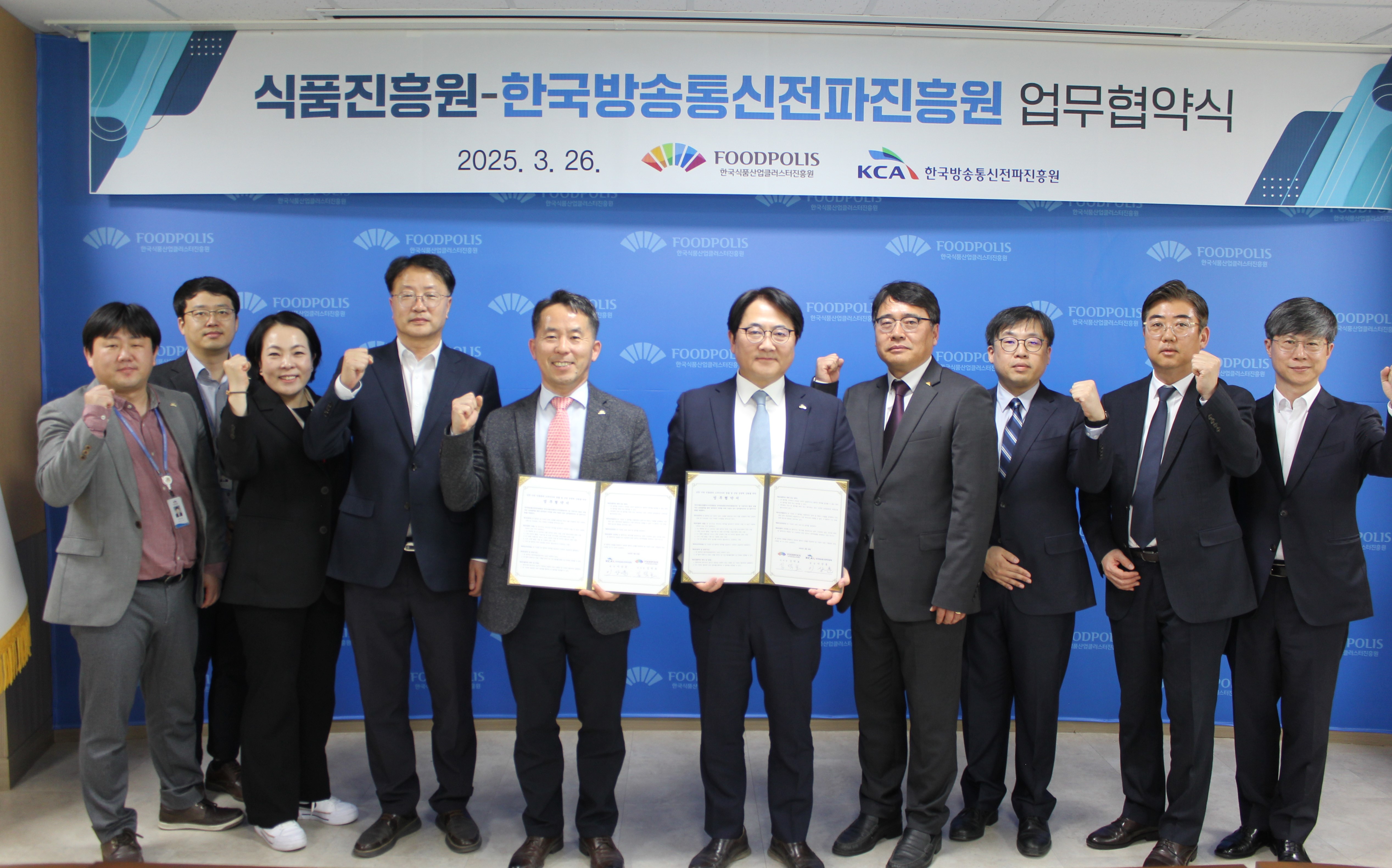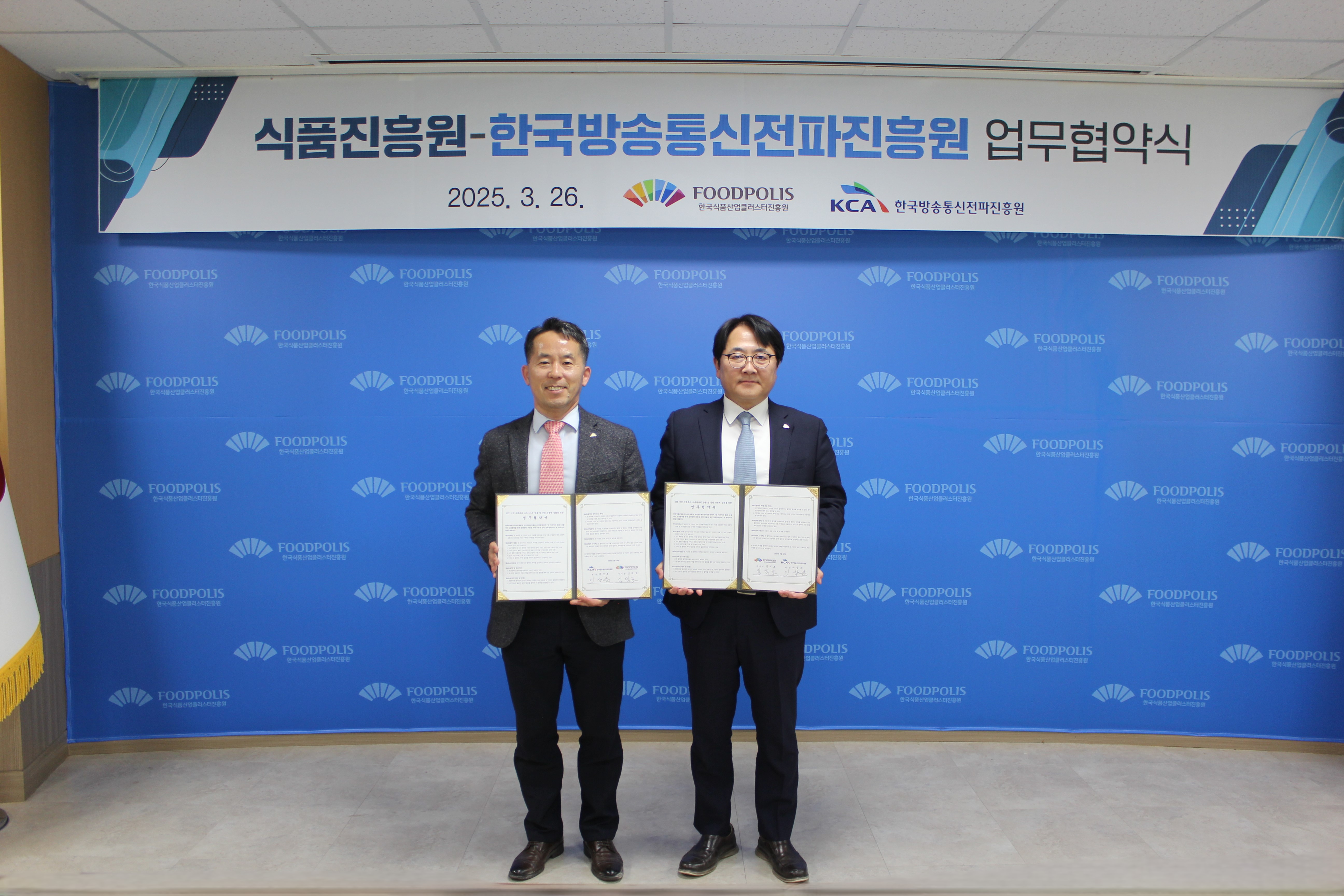 한국식품산업클러스터진흥원(이하 ‘식품진흥원’)과 한국방송통신전파진흥원이 3월 26일 식품산업의 디지털 전환과 기술혁신을 위한 업무협약식(MOU)을 체결했음을 밝혔다.