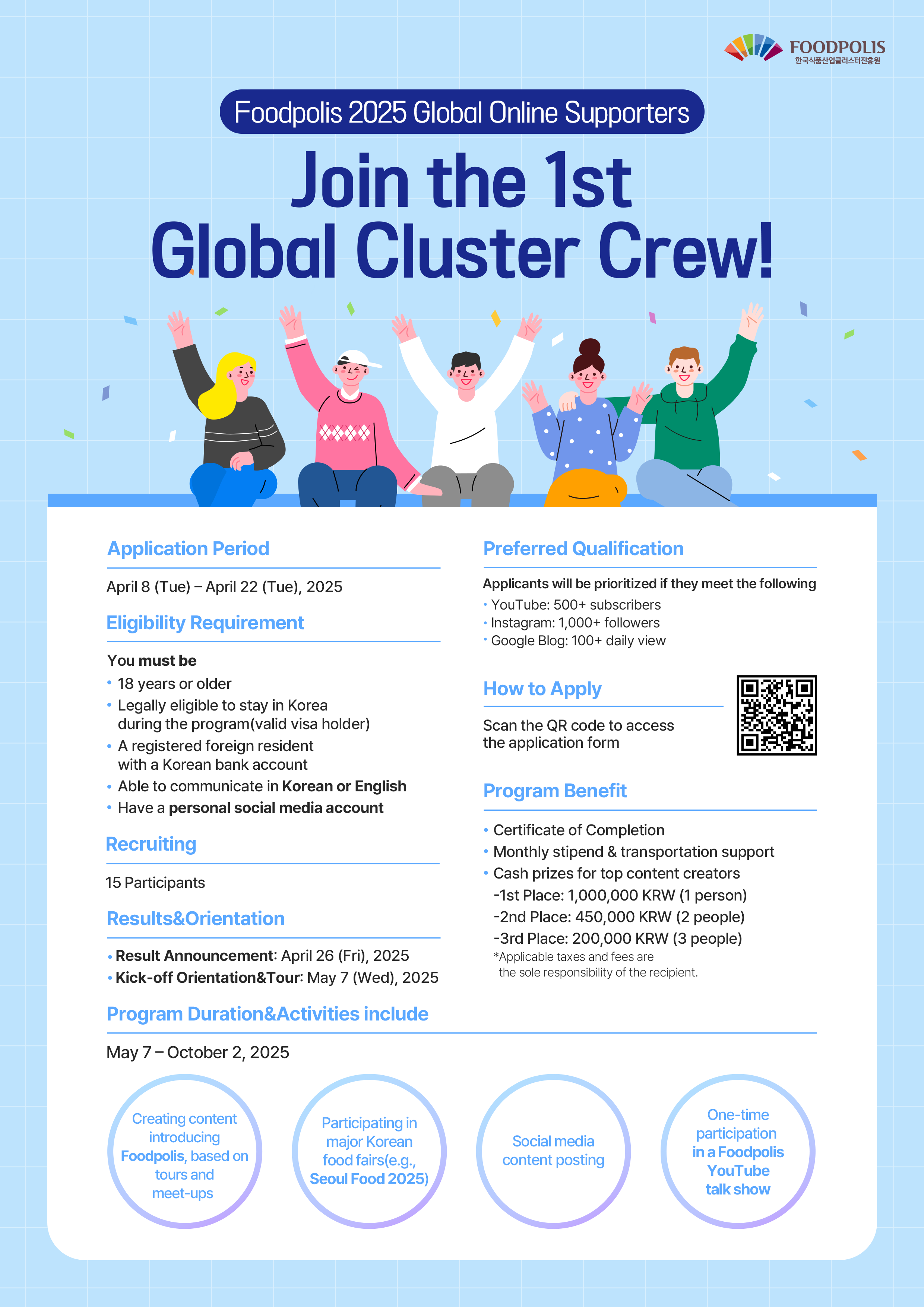 Foodpolis is now recruiting the 1st Global Cluster Crew — a team of international content creators who will promote the vision and vibrancy of Korea's national food industry cluster. If you are a passionate storyteller and social media creator currently residing in Korea, this is your chance to represent Foodpolis on a global stage! 📅 Application Period: April 8 (Tue) – April 22 (Tue), 2025 👥 Recruitment: We are looking for 15 global supporters. ✅ Eligibility Applicants must: 1. Be at least 18 years old 2. Hold a valid visa and be eligible to stay in Korea during the program 3. Be a registered foreign resident with a Korean bank account 4. Be able to communicate in either Korean or English 5. Own at least one personal social media account(participants will use their accout to create content) 🌟 Preferred Qualifications Priority will be given to applicants who meet the following criteria: YouTube: 500+ subscribers Instagram: 1,000+ followers Blog (Google): 100+ daily views 📝 How to Apply Application link: https://forms.gle/KzbzHoazzRTyNu8a8 or Scan the QR code on the flyer to access the application form. 📢 Results & Orientation Selection Results: April 26 (Fri), 2025 Kick-off Orientation & On-site Tour: May 7 (Wed), 2025 🎁 Benefits Monthly activity stipend and transportation support Special content creation awards: 🥇 1st Place: KRW 1,000,000 (1 person) 🥈 2nd Place: KRW 500,000 (2 people) 🥉 3rd Place: KRW 200,000 (3 people) 📆 Program Duration May 7 – October 2, 2025 Participants will: Create digital content introducing Foodpolis, based on field visits and events Take part in major Korean food fairs, including Seoul Food 2025 Join a special talk show on the official Foodpolis YouTube channel Join us and share the story of Foodpolis with the world! Let’s shape the future of food — together. 📌 Important Notes * To successfully complete the program and receive all benefits, participants must: 1. Attend the official orientation, 1st and 2nd On-site tour, and the Wrap-up ceremony 2. Submit a minimum of 3 original content pieces during the program period(out of 5) 3. Follow branding and content guidelines provided by the organizers * Failure to meet the above conditions may result in partial withdrawal of benefits and disadvantages in award evaluation. * Special content cash prizes will be paid after deduction of applicable taxes (e.g., income tax).