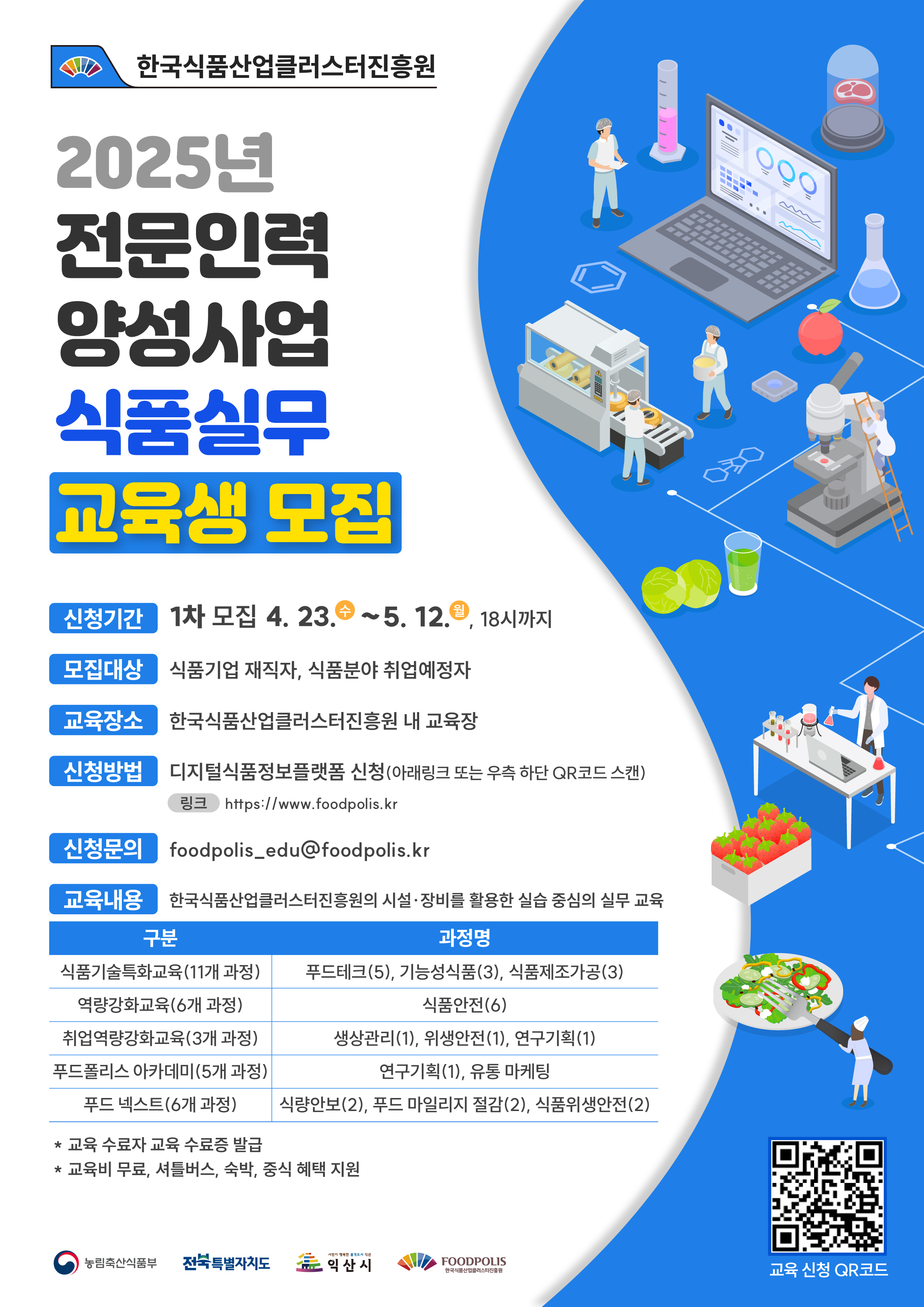 한국식품산업클러스터진흥원(이사장 김덕호, 이하 식품진흥원)이 지난 4월 23일부터 ’식품실무교육‘ 교육생 모집에 나섰다.