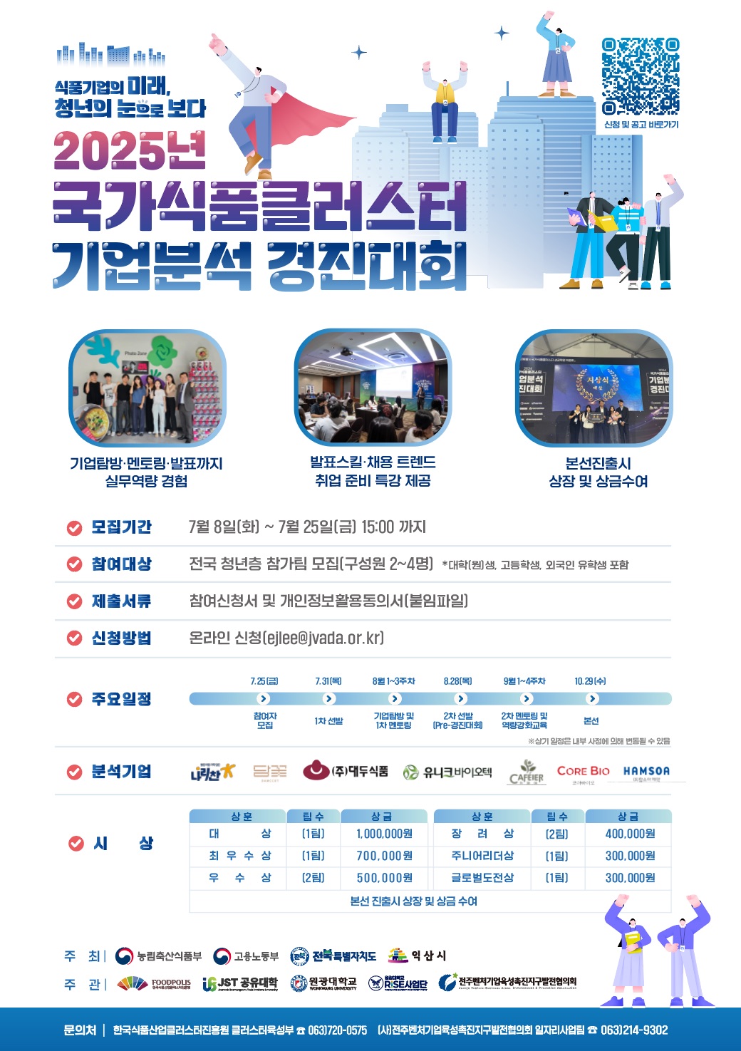 한국식품산업클러스터진흥원(이사장 김덕호, 이하 ‘식품진흥원’)이 농림축산식품부가 지원하는 ‘2025년 식품기업 인력수급 지원사업’에 따라, 전국 청년을 대상으로 ‘국가식품클러스터 기업 분석경진대회(이하 ‘경진대회’)’ 참가자를 7월 25일까지 모집한다고 밝혔다.
