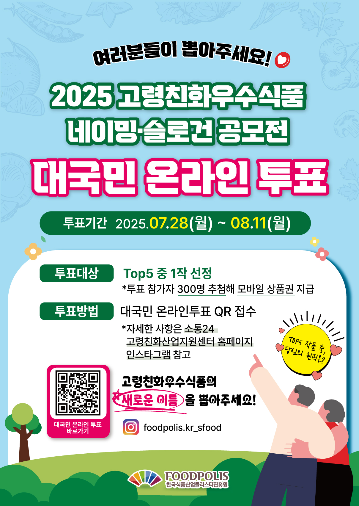 공모전은 만 18세 이상 대한민국 국민 누구나 참여할 수 있으며, 소통24, 씽굿, 인스타그램(@foodpolis.kr_sfood)을 통해 6월 27일(금)부터 7월 11일(금)까지 접수할 수 있다.