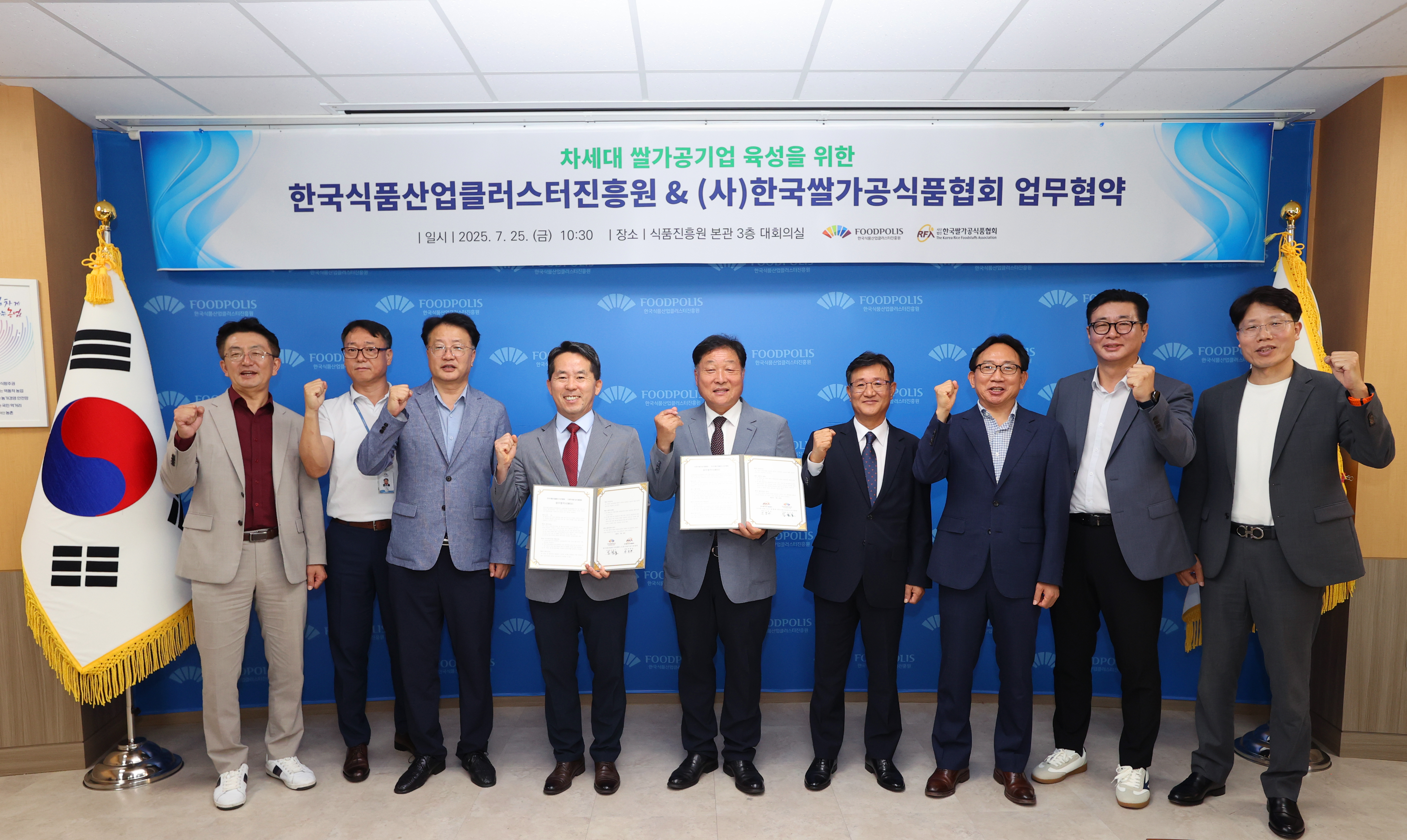 한국식품산업클러스터진흥원(이사장 김덕호, 이하 식품진흥원)은 7월 25일, 한국쌀가공식품협회(회장 박병찬, 이하 협회)와 쌀가공산업의 지속가능한 성장과 차세대 경영인 양성을 위한 업무협약(MOU)을 체결했다고 밝혔다.