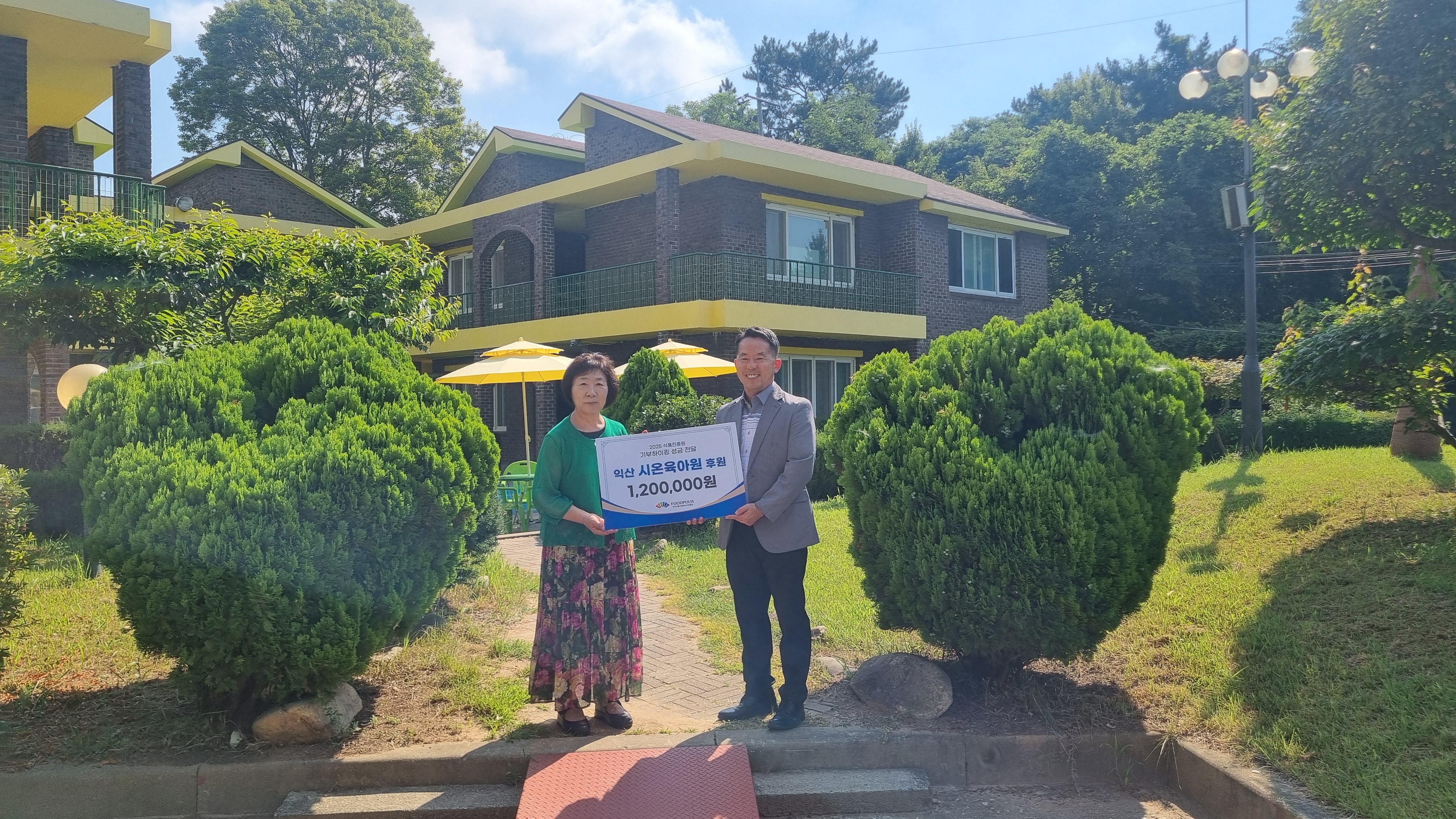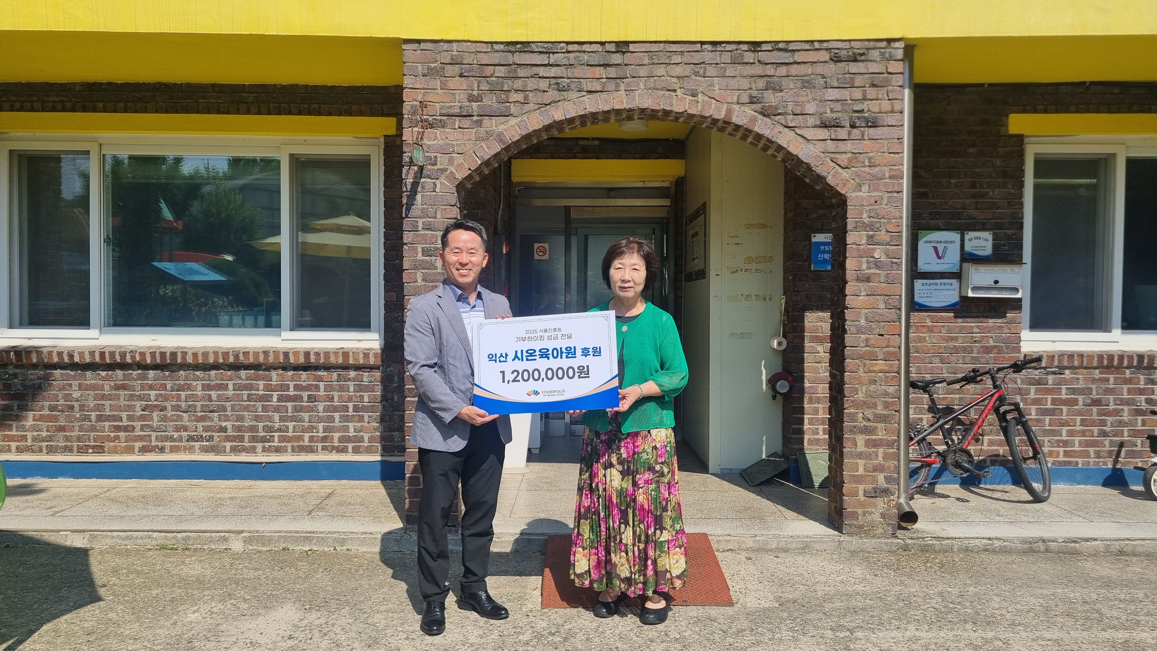 한국식품산업클러스터진흥원(이사장 김덕호, 이하 식품진흥원)은 7월 30일(수), 익산시 왕궁면에 위치한 아동복지시설 시온육아원을 방문해 기부하이킹을 통해 모은 성금 120만 원을 전달했다고 밝혔다.