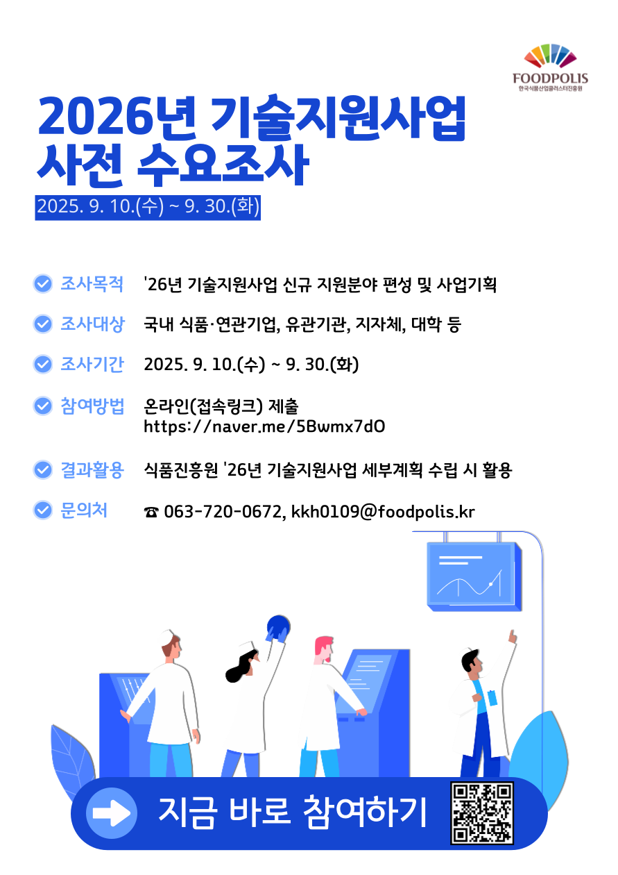 한국식품산업클러스터진흥원(이사장 김덕호, 이하 식품진흥원)은 2026년 기술지원사업 수요조사(이하 수요조사)를 9월 10일부터 9월 30일까지 진행한다고 16일 밝혔다.