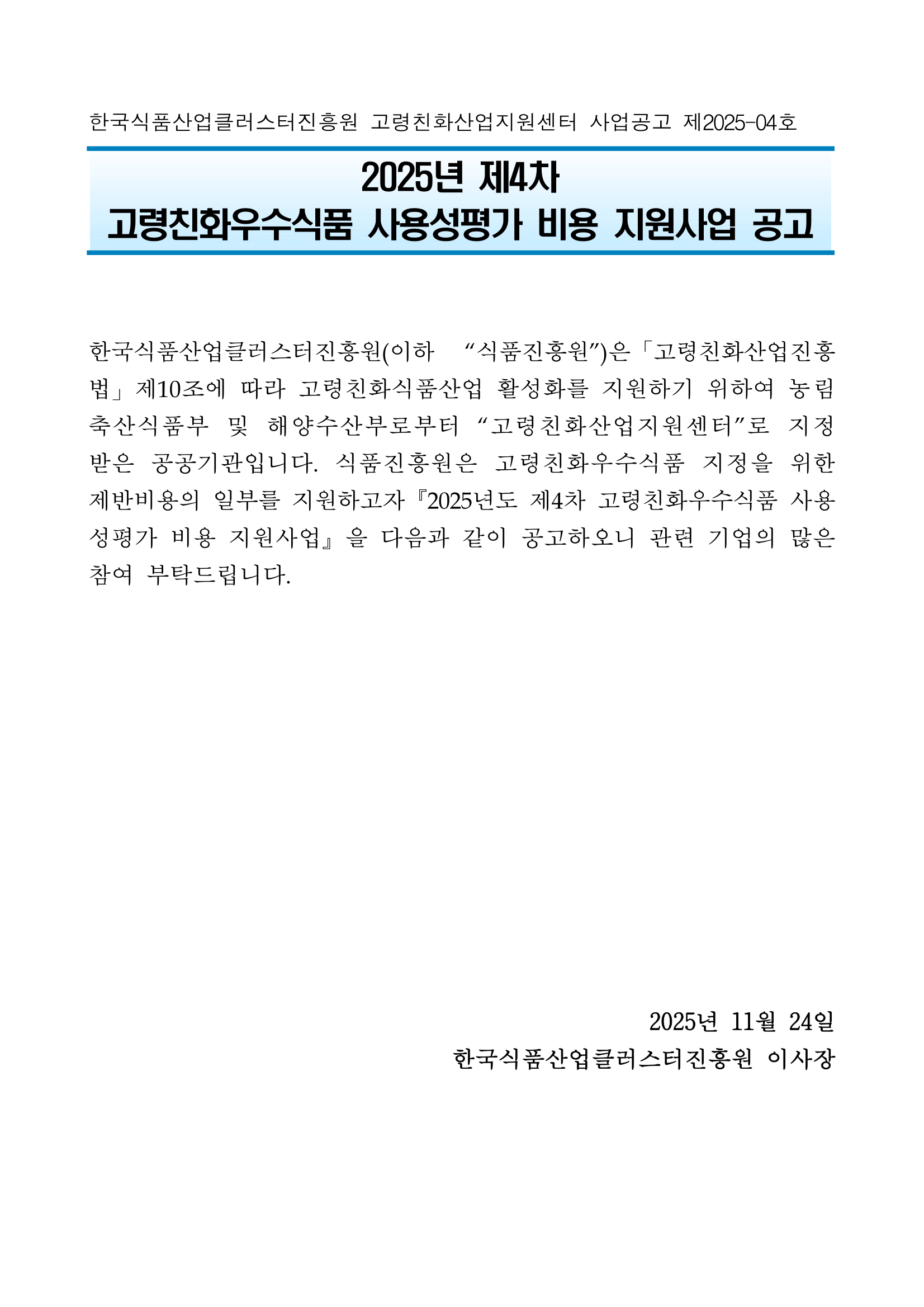 한국식품산업클러스터진흥원 고령친화산업지원센터 사업공고 제2025-04호